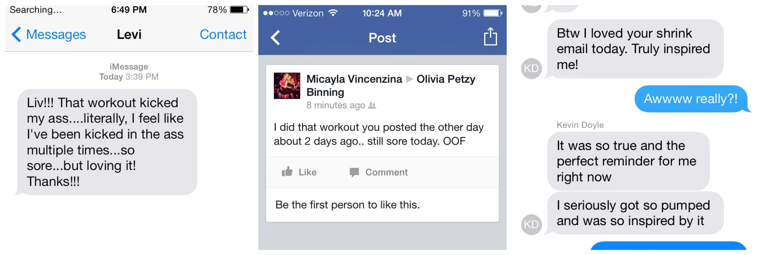 “I found tears coming down my face through the conclusion of my first Shrink Session class with Olivia. They were tears of happiness & revelation. The class is the most intense workout I’ve ever had, yet it doesn’t tire me out like other workouts. Instead, it gives me energy and gives me life. I believe it takes a very special person & soul to teach this class. Olivia is a supportive, fun, and fabulous instructor. She is an inspiration and a positive light. I am grateful every day that I allowed & welcomed the beauty & power of Shrink Session into my life!”
